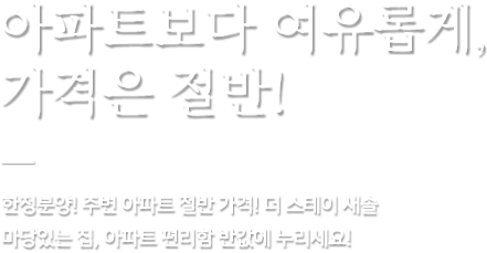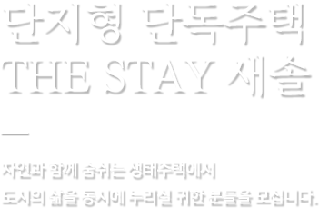 Signiture High-End 생태주택, THE STAY 새솔 광역교통망으로뛰어난 교통 요건 도보 10분 거리의탁월한 학세권 자연 친화적인쾌적한 환경 공세권 건강이 최우선인환경 체세권 서남권의 교통요지 역세권 THE STAY 새솔 분양문의언제 어디서나 친절하게 고객님의 문의에 답변드리겠습니다. TEL 010.6373.2354홍보관 : 경기도 화성시 큰나래1길 3-7. 1층 관련문의 제목 작성일 PREMIUM01홈엘리베이터 노부모님, 아이들 안전까지. . .내 집 안에서 바로 연결되는 편리함 PREMIUM02피트니스센터 피트니스센터 및 요가실(바닥 댄스플로어 설치) PREMIUM03스크린 골프 무료 스크린 골프(세대당 락커룸 별도제공) PREMIUM04카라반 입주만 해도 카라반이 평생 내것 처럼,23세대가 365일 공유 연16일씩 배정